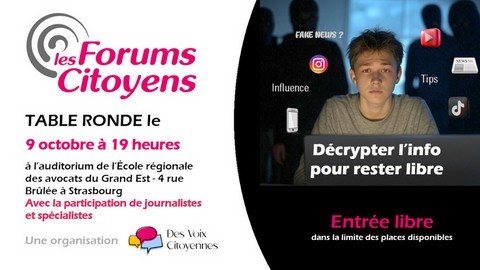 l’association Des Voix Citoyennes organise un nouveau Forum Citoyen pour les lycéens, étudiants et parents, sous forme d’une table ronde avec des journalistes et universitaires à l’auditorium de l’École régionale des avocats du Grand Est.